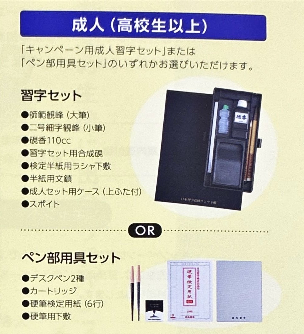 キャンペーン中の新規ご入会で、お習字セットまたはペン部用具セットを無料進呈!!(下の写真)