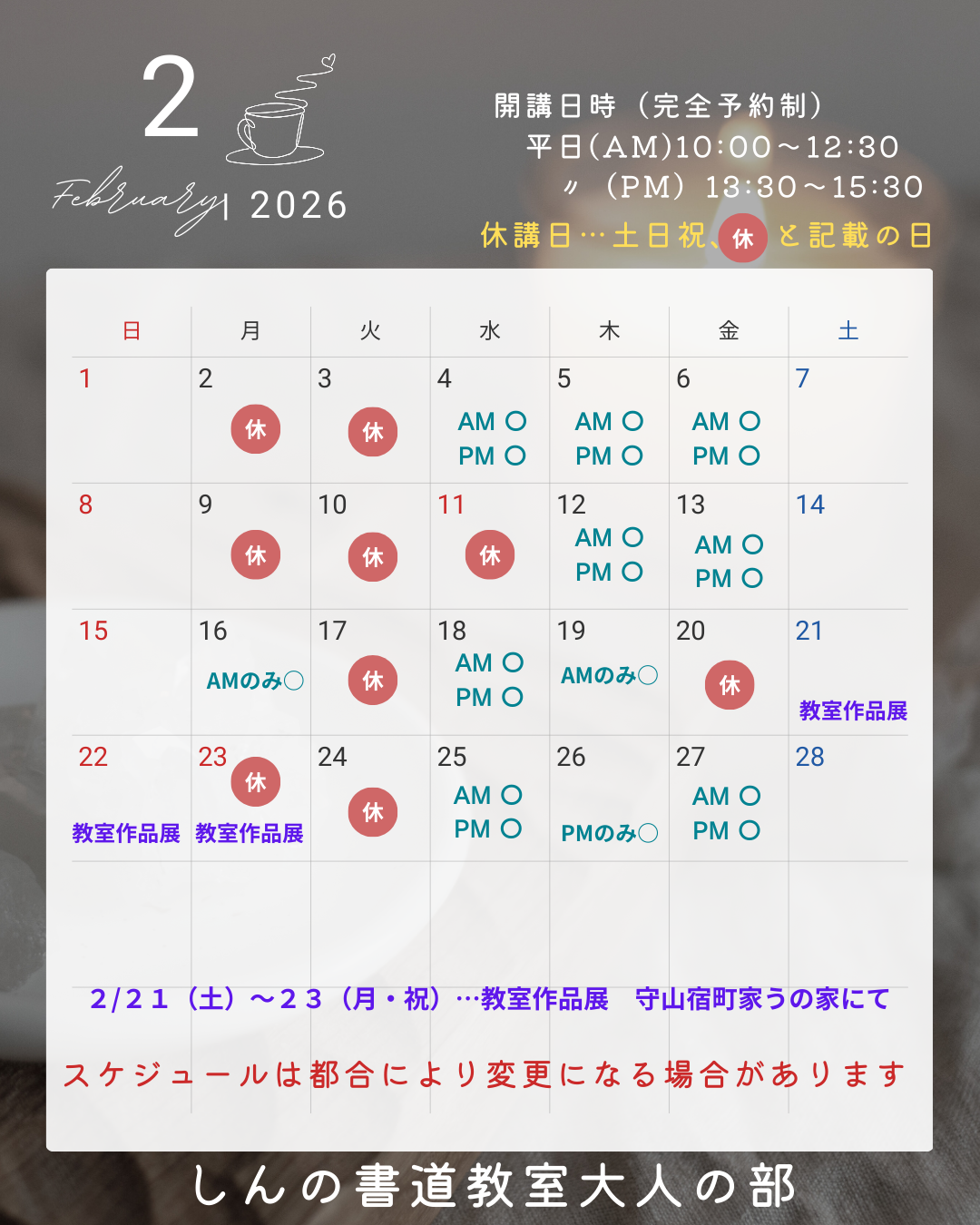 下のカレンダーの○の日が開講可能日です。(要予約)