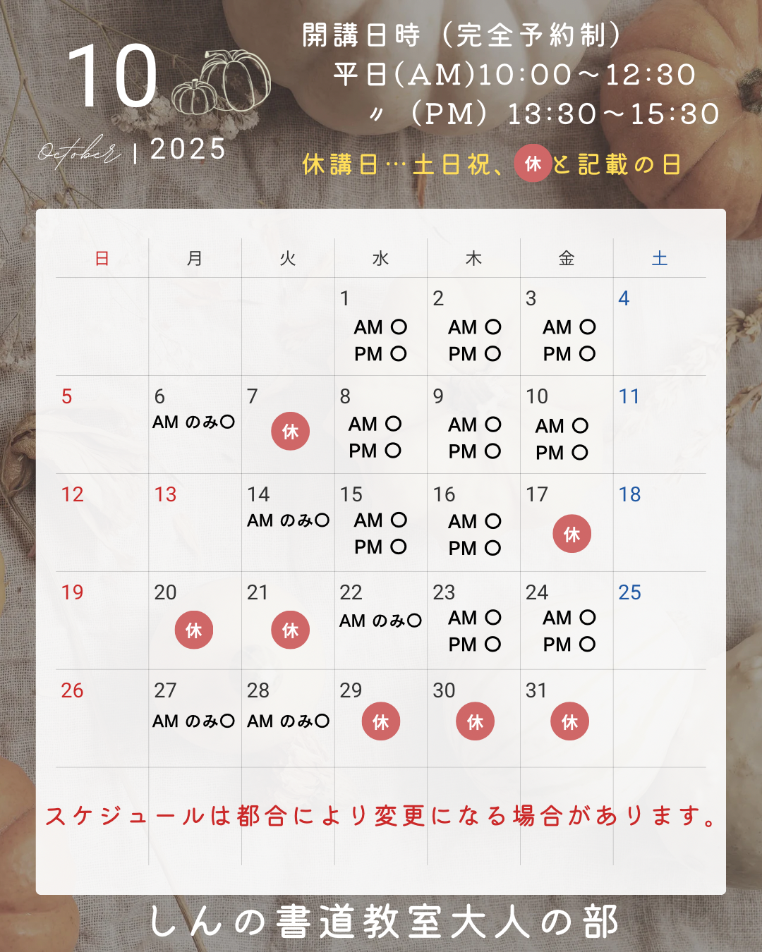 成人の方はお仕事やご家庭の都合もおありかと思いますが、会費(手本代)や当教室の受講チケットは前納制でご返金不可のため、その点ご注意くださいませ。
